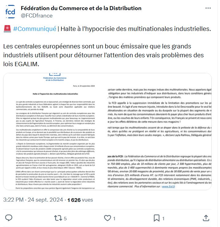 La FCD a publié le 24 septembre un communiqué (PJ) dans lequel elle s’en prend à « l’hypocrisie des multinationales industrielles » sur la question des centrales internationales, lesquelles pour le plus grand bien des consommateurs massifient les achats de produits « bien souvent fabriqués dans les mêmes usines pour toute l’Europe, quel que soit le pays de livraison » ; la liste des produits concernés par cette assertion hardie et leur poids dans le panier moyen ne sont pas fournis par la FCD. Et celle-ci croit pouvoir affirmer aussi que les « plus grosses multinationales », sans plus d’indication sur les filières concernées, « pour beaucoup ne s’approvisionnent pas ou peu auprès de l’agriculture française ». Les agriculteurs français fournissant les deux tiers des approvisionnements agricoles des entreprises de l’Ilec, une conclusion s’impose : l’Ilec n’est plus le « lobby des multinationales » !
