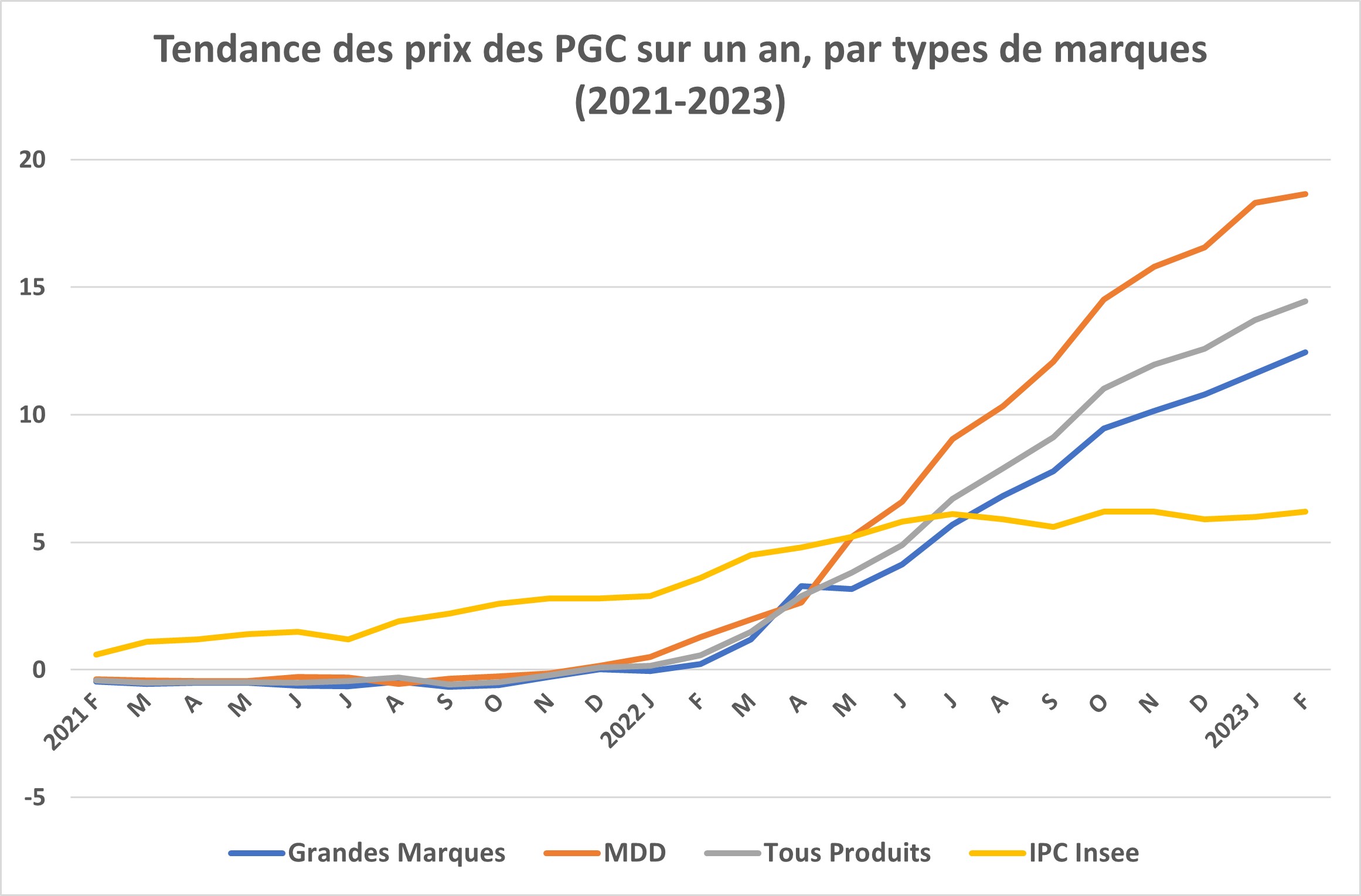 À 14,3 et 14,2 % , la hausse de prix des PGC sur un an touche un peu moins les hyper et supermarchés que la proximité et le drive (un point de plus) sur un an. Elle est moins le fait des marques, 12,45 % toutes catégories confondues, que des MDD (18,66 %).