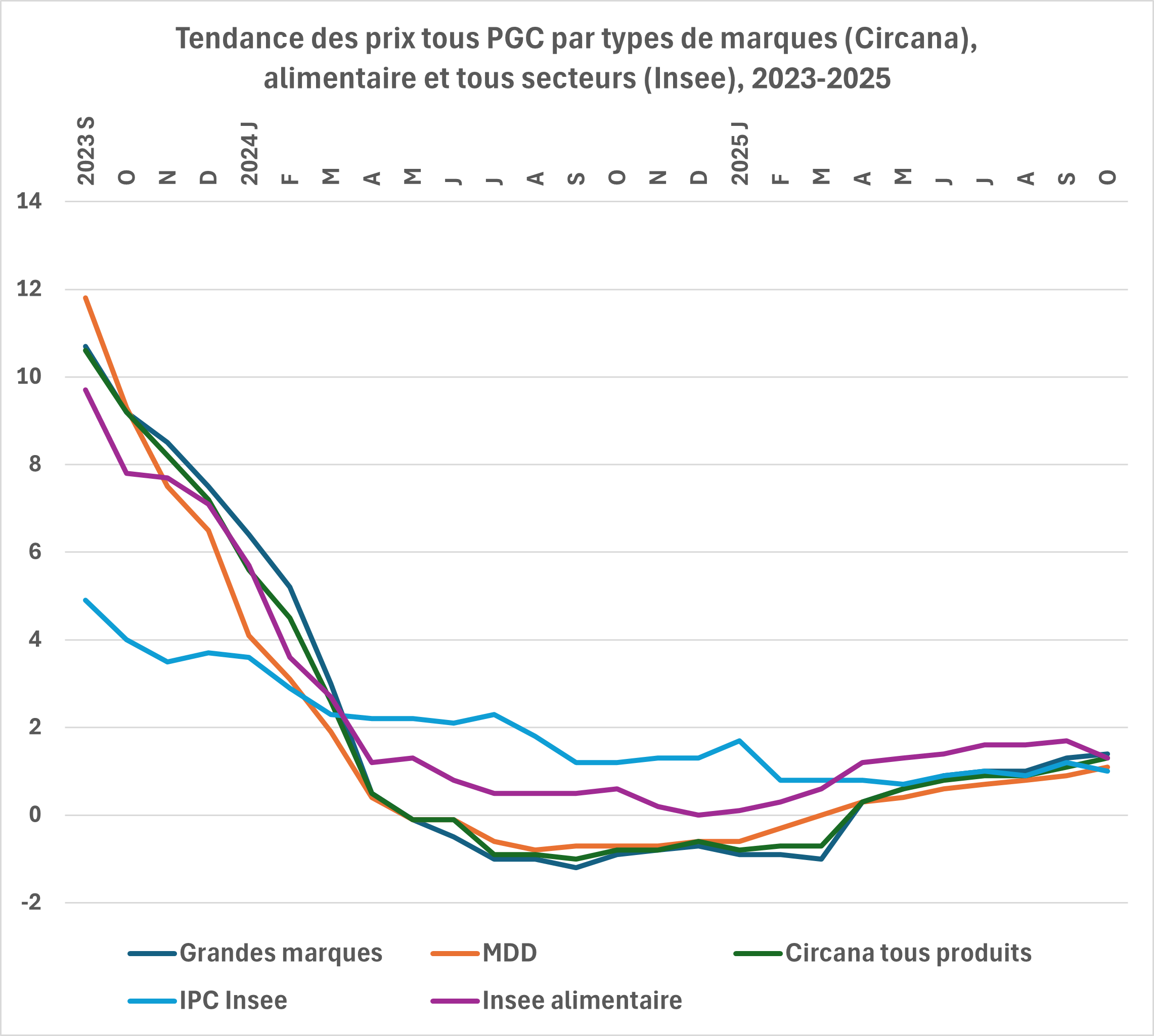 Considérés à un an d’intervalle, les prix des PGC de la demande sont en revanche en hausse, pour le septième mois d’affilée, et de 1,3 % par rapport à octobre 2024. La tendance ayant été déflationniste jusqu’en mars 2025, cette tendance à une hausse des prix plus forte de mois en mois sur un an devrait se poursuivre quelques mois.