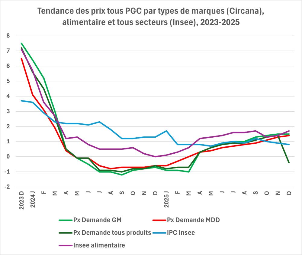 Considérés à un an d’intervalle, les prix des PGC de la demande sont en hausse, pour le neuvième mois, de 1,4 % par rapport à décembre 2024, ce qui marque une relative inflexion de la tendance, la base de référence étant une période encore déflationniste en 2024.
