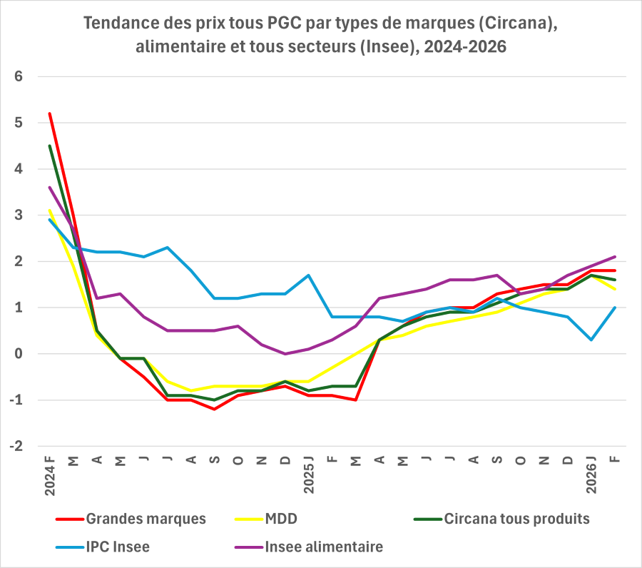 Les prix ont été en baisse de 0,6 % en hypermarchés, de 0,2 % en supermarchés, et de 0,7 % en drives par rapport à janvier, en hausse de 0,1 % en proximité. Globalement, cette tendance à court terme a été le fait des marques dont les prix ont baissé de 0,5 % , tandis que ceux des MDD ne reculaient que de 0,1 % . La tendance a été très homogène, varient entre – 0,7 % dans l’entretien et 0 % dans les surgelés ou – 0,1 % dans les BRSA et les spiritueux.